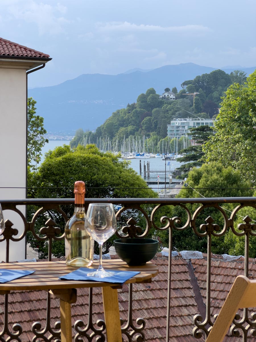 Un tavolino in teak con sedie permette di fare colazione sul balcone con vista lago.