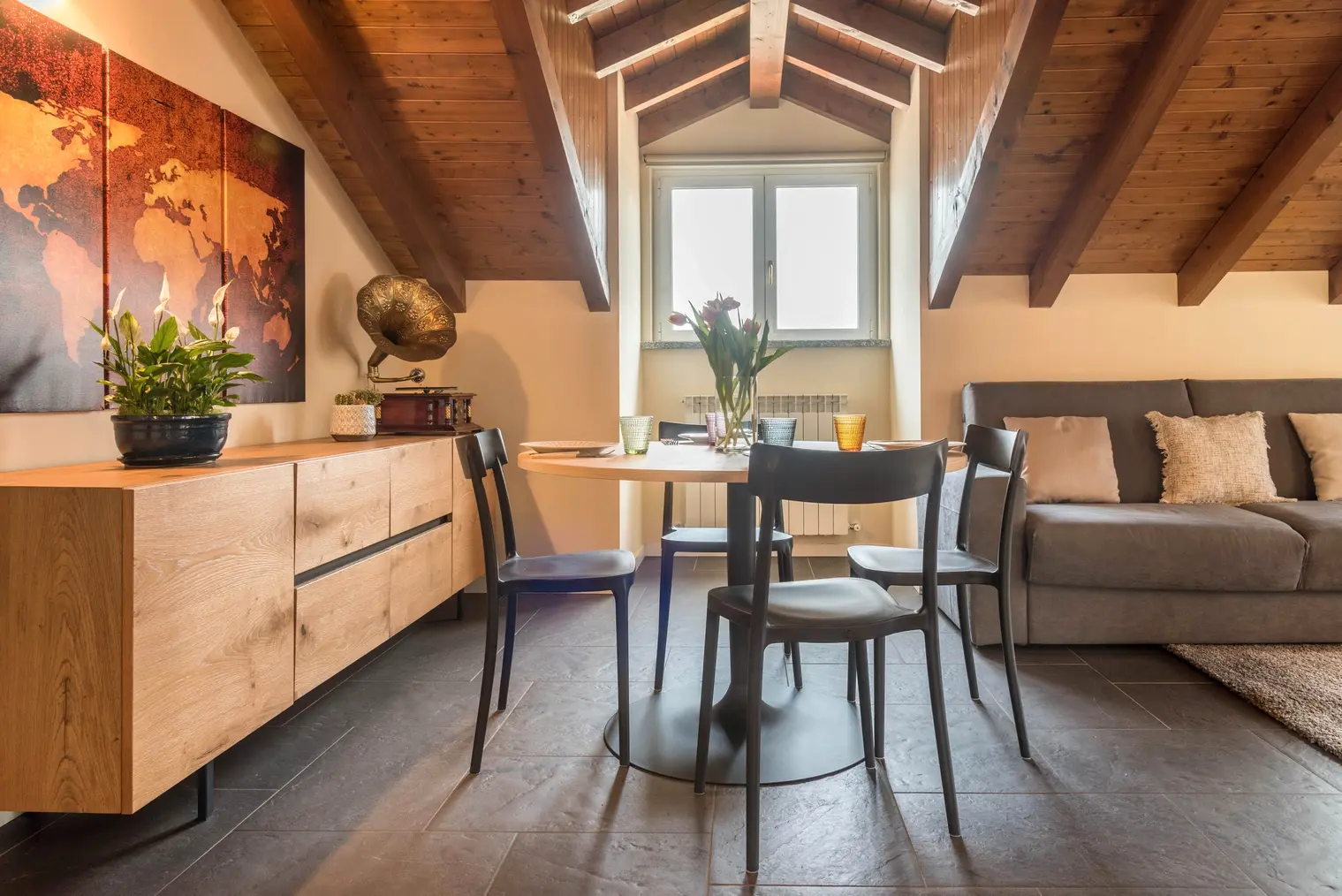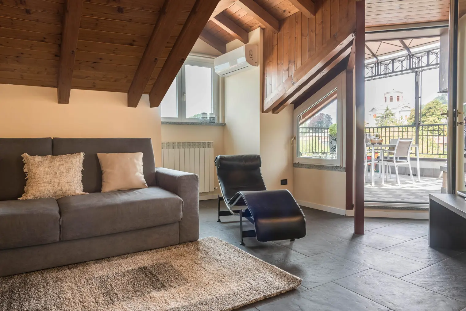 The holiday apartment “Maison Vittoria Lago Maggiore'' is located in Laveno, right next to the harbour. The beautiful top-floor apartment with a view of Lake Maggiore consists of a living/dining room, a well-equipped kitchen, one bedroom as well as one bathroom and can therefore accommodate 4 people. Additional amenities include free Wi-Fi , air conditioning, a washing machine and a television. Your private covered terrace, furnished with a table and chairs, is the perfect place to end the day with a glass of wine while you enjoy the views. Due to its excellent location, restaurants, bars and cafes can be reached in just 2 minutes on foot and the nearest supermarket is less than a 1-minute walk away (99 m).