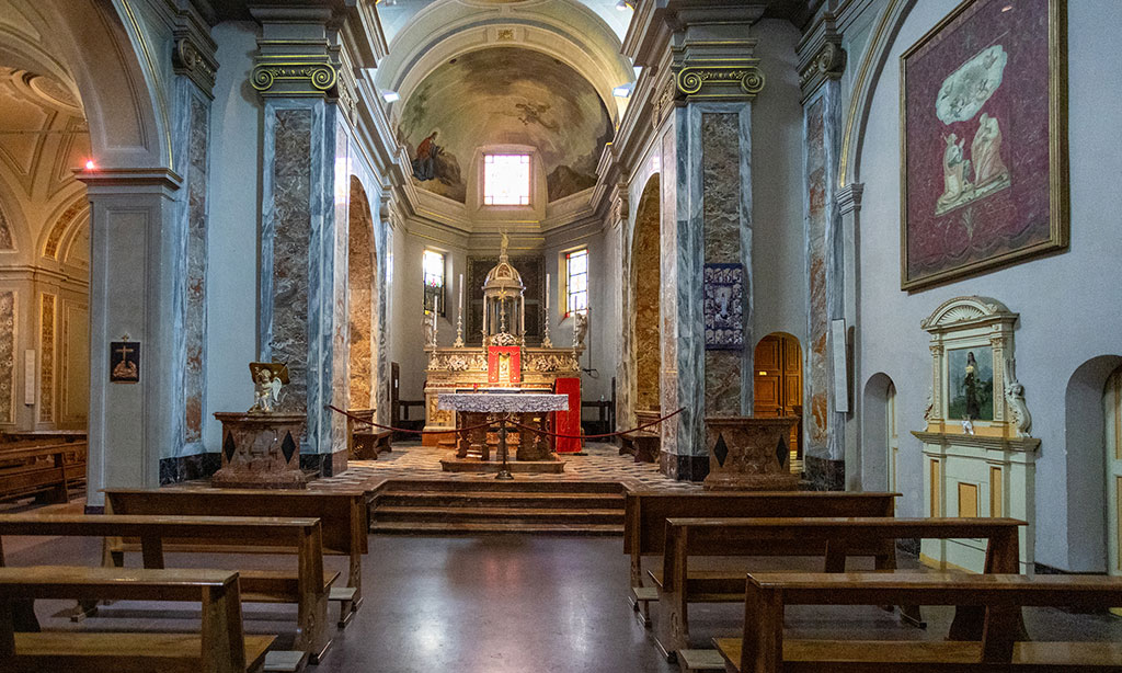 All’interno si conservano opere di notevole pregio: la statua lignea della Madonna del Transito (1645), affreschi di G. Albertella (1925), dipinti devozionali di varie epoche, una Via Crucis realizzata da Innocente Salvini e uno stendardo ricamato della Confraternita del Santissimo Sacramento. Di rilievo anche l’organo costruito da Eugenio Biroldi nel 1825 e successivamente restaurato dalla famiglia Mascioni.